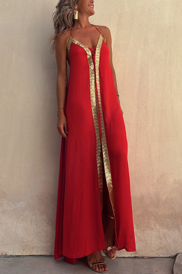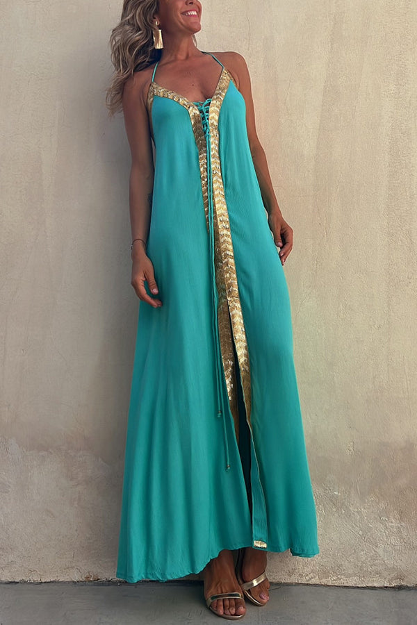 Del Mar Sequin Trim Lace-up Halter Elastic Back Maxi Dress