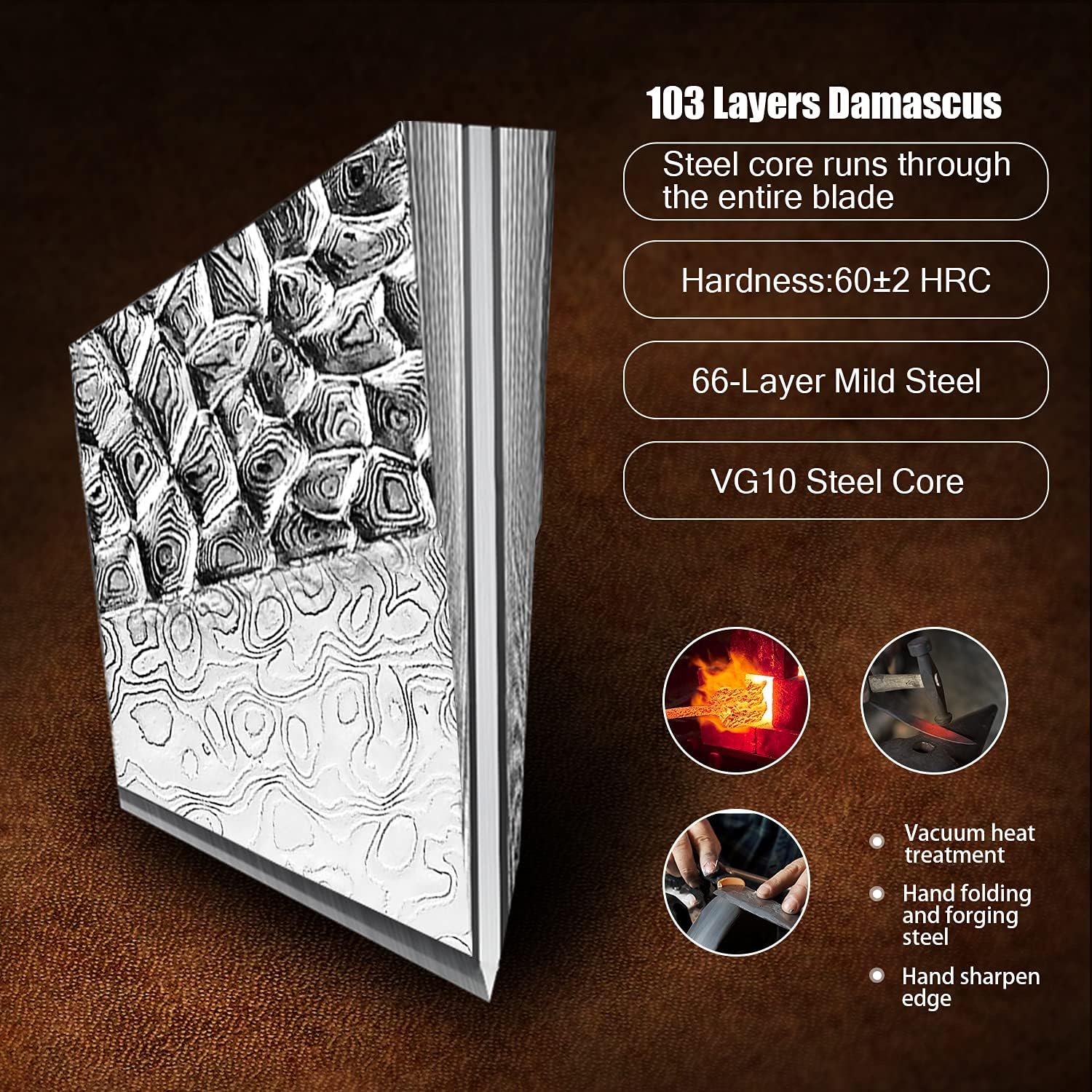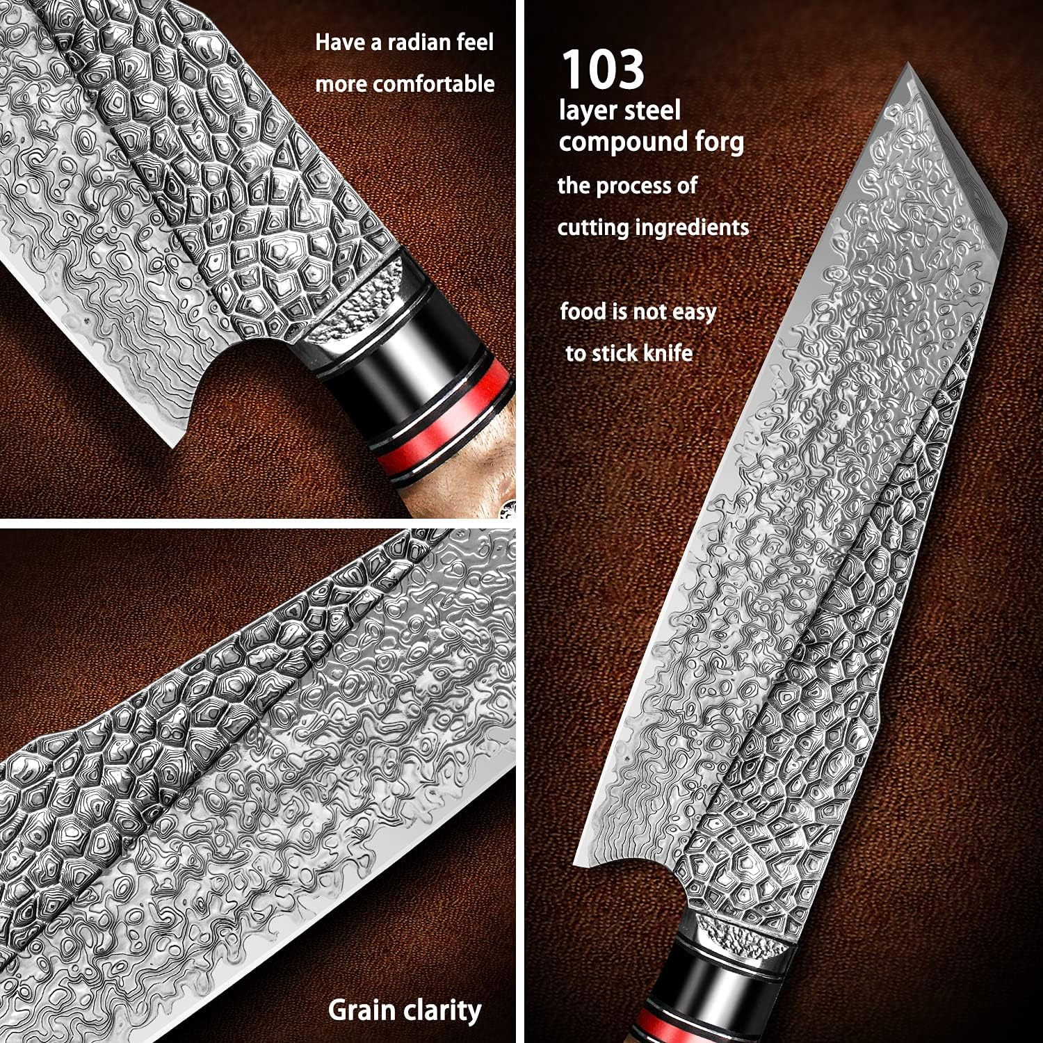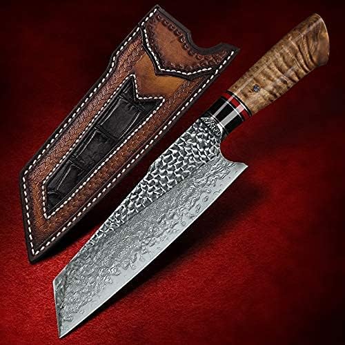 Crafted with precision and expertise. the KD 73 Layers Damascus Steel Chef Knife is a kitchen essential. The rare burl wood handle and sheath provide a comfortable grip and protect the sharp. 73-layer blade. Experience the unmatched quality and durability of this chef knife. a must-have for any cooking enthusiast.