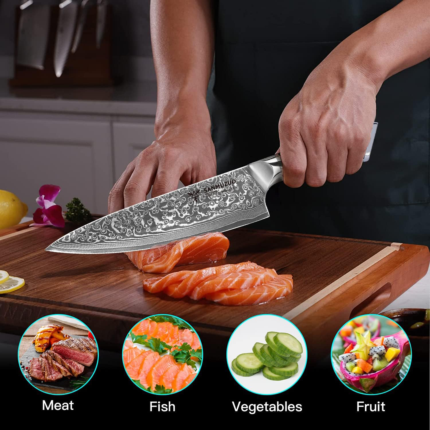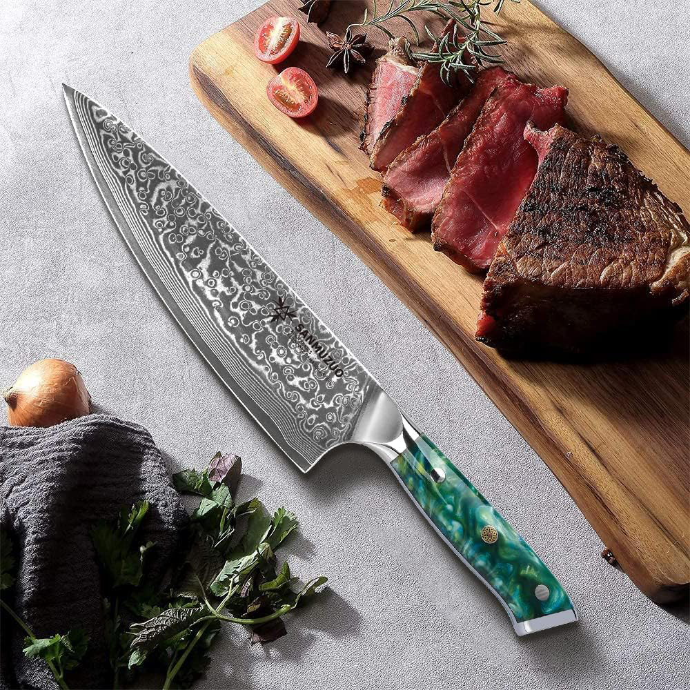 This KD 8 VG10 Damascus Steel Chef Knife is the perfect kitchen essential for professional and home cooks alike. Its Japanese steel blade is strong and durable. designed for smooth and effortless slicing. With a jade green gift box. this knife is the perfect gift for any chef.