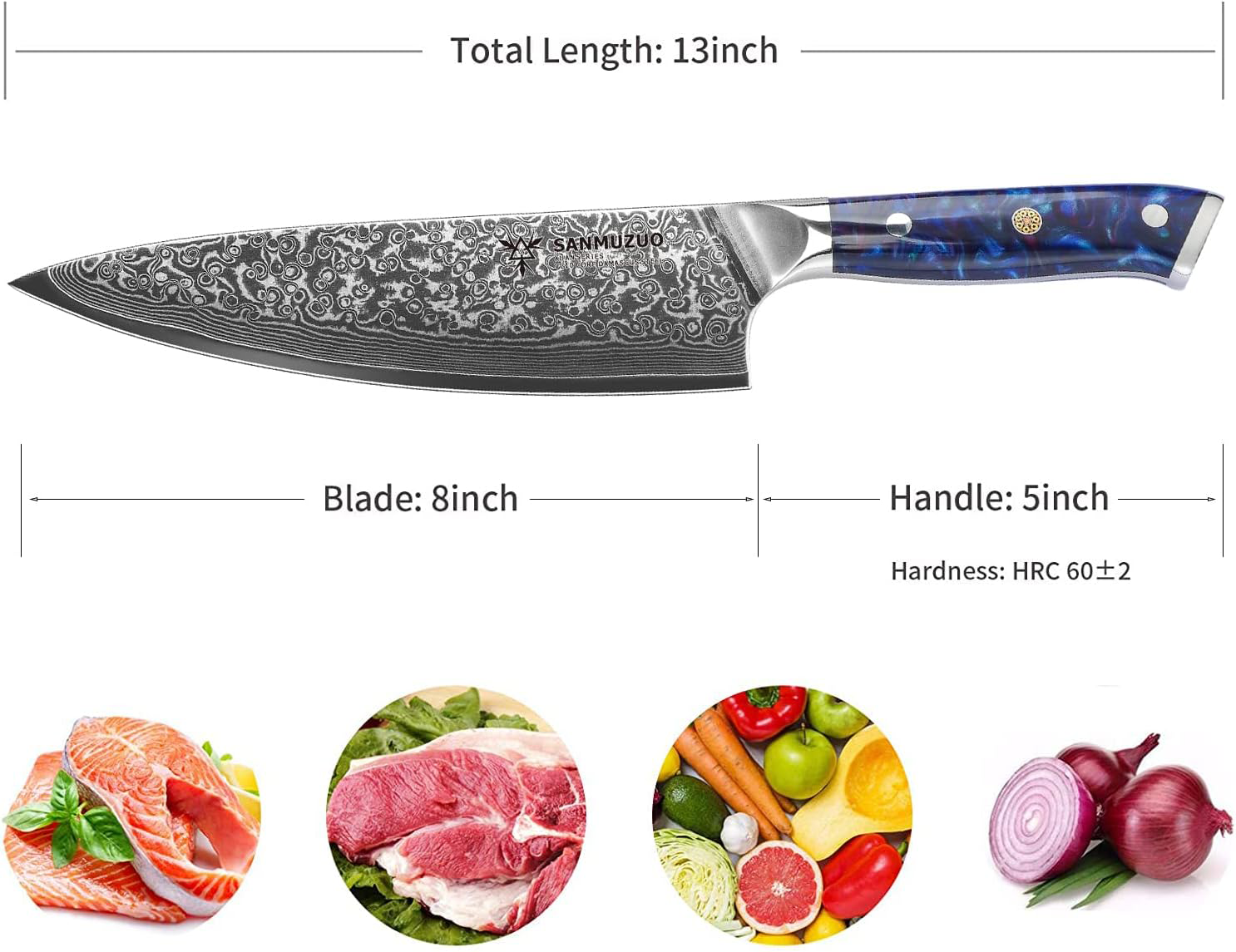This KD 8 VG10 Damascus Steel Chef Knife is the perfect kitchen tool for slicing. dicing. and precision cutting. The VG10 Japanese super steel core is clad in 66 layers of Damascus steel and hand polished. creating a long-lasting and corrosion-resistant blade. The classic Sapphire Blue Gift Box makes for a stunning and unique presentation.
