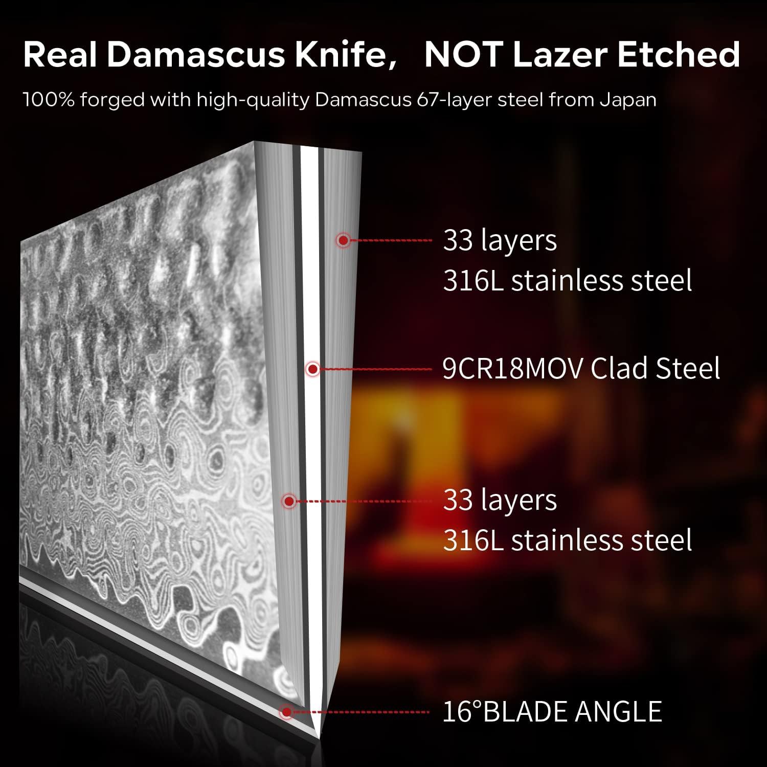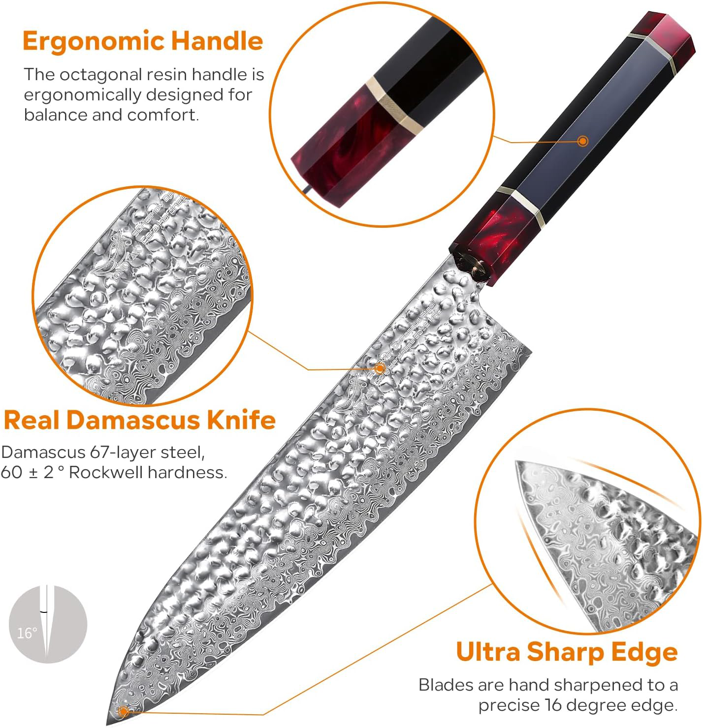 A professional chef's must-have. this KD Japanese 67-layer Damascus Chef Kitchen Knife offers an impressive blend of strength and durability. Its 67 layers of steel construction give the blade unparalleled cutting power. making it a reliable choice for all your cooking needs. Plus. it comes in a nice gift box to treat the culinary enthusiast in your life.