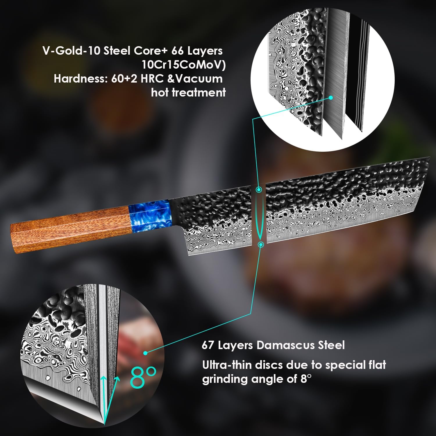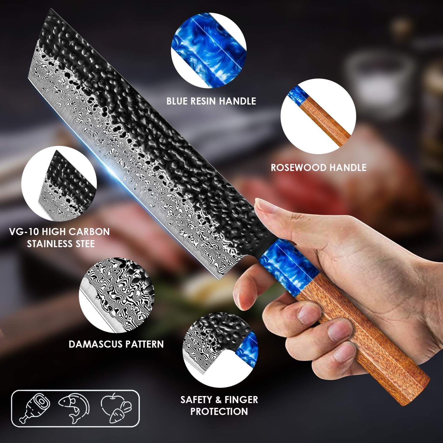 Experience the precision and quality of Japanese craftsmanship with our KD Nakiri Chef Knife. Made with VG 10 high carbon stainless steel. this 7-inch Damascus kitchen knife is perfect for all your meat cooking needs. The ergonomic G10 handle provides comfort and control. making it a must-have in any chef's arsenal. Comes with a beautiful gift box for presentation.