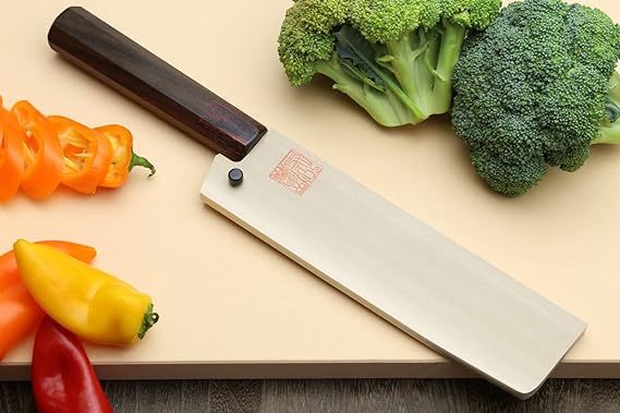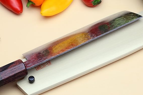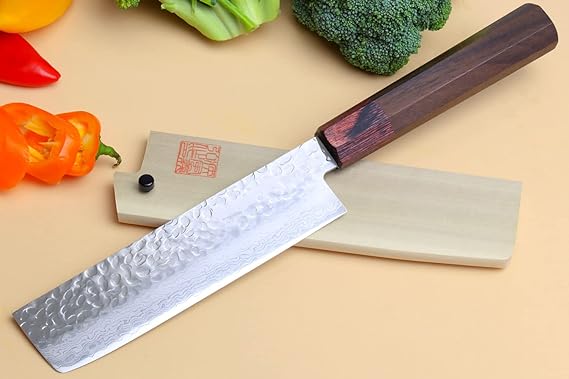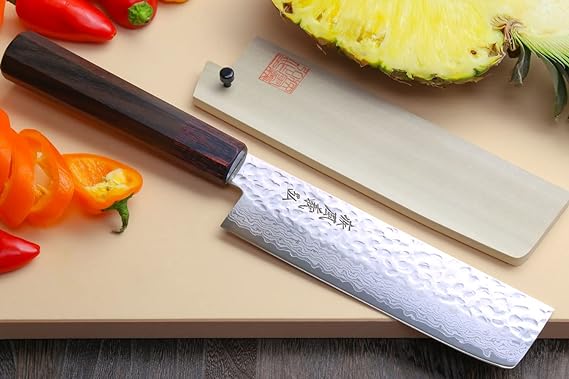 This Yoshihiro VG-10 46 Layers Hammered Damascus Nakiri Japanese Vegetable Knife (6.5'' (165mm) Rosewood Handle) is expertly crafted with a hammered Damascus design and a durable VG-10 steel blade. The 46 layers of steel provide superior strength and precision for effortless vegetable cutting. The elegant rosewood handle adds a touch of sophistication to this essential kitchen tool.