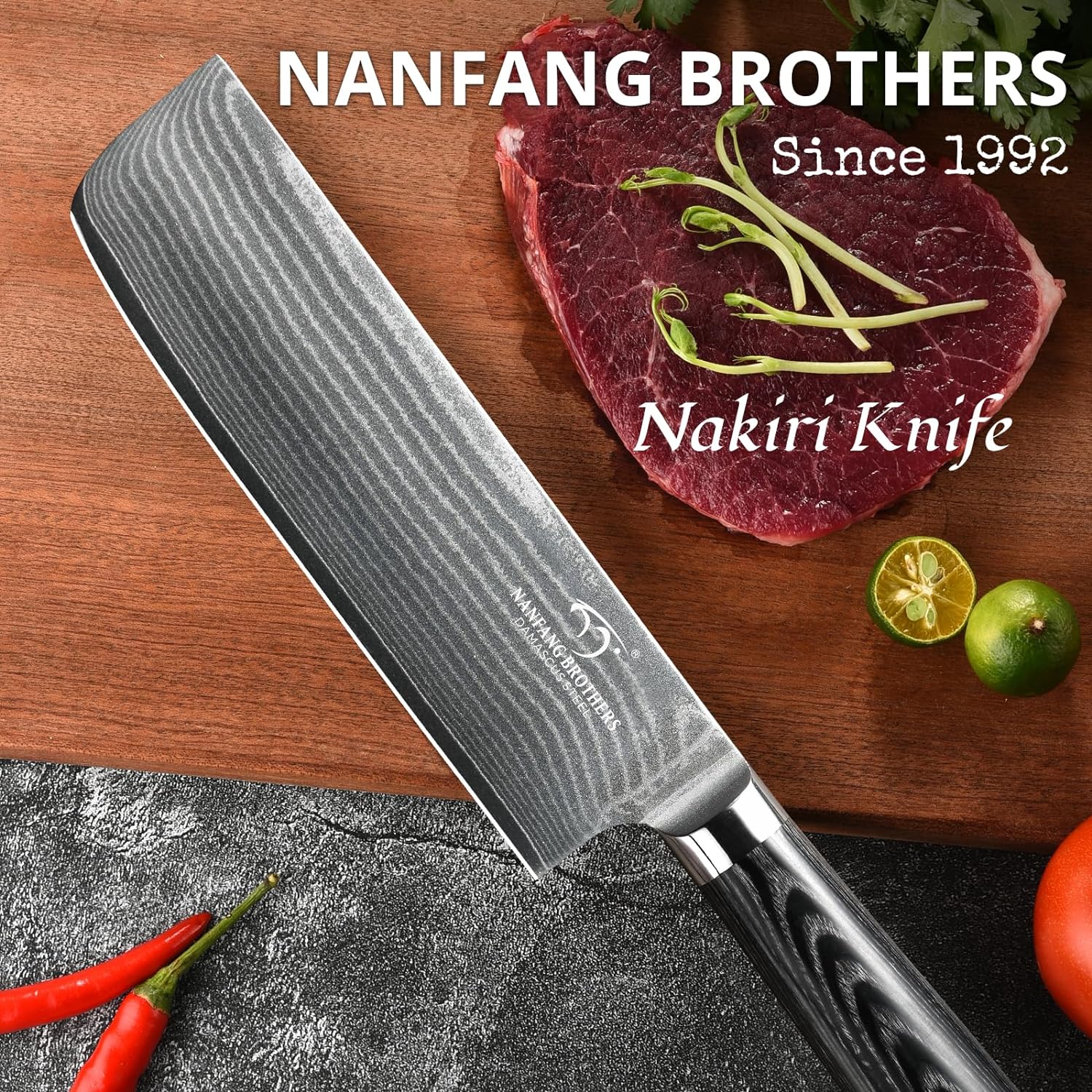The Nakiri knife. a culinary masterpiece. is renowned for its lightweight. razor-sharp blades that effortlessly slice through vegetables. The high-grade Damascus steel blade guarantees exceptional edge retention and durability. Paired with a high-end wooden handle. the ergonomic design ensures a comfortable grip. enabling precise and effortless cutting. The knife's natural wood patterns enhance its overall aesthetic. transforming food preparation into a delightful experience.